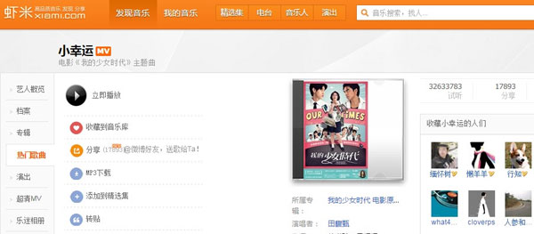 音乐圈是一个比朋友圈更加复杂多变得区域,朋友圈最多出现的是微商,而音乐圈更多的出现的是奇迹。作为一部看起来不错青春校园爱情电影,《我的少女时代》将十分俗套的故事演绎的十分耐看,不过最为传奇的不仅仅是电影,而是那首叫《小幸运》的主题曲在虾米音乐上3263万以上的播放量。
