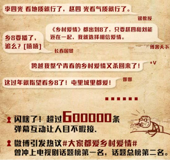 腾讯视频围绕《乡村爱情8》烹制出多角度、多元化营销内容“开胃大餐”,极大的提升的用户的互动热情。《乡村爱情8》的预告片、花絮等自然不会少,为最大限度调动网友的观看和互动热情,腾讯视频更是独家打造了《其实TFBOYS也是咱屯里人》《高逼格权力游戏版乡村爱情》《赵四在跳街舞,此视频有毒!》等跨次元搞笑周边视频,引发了网友的观看和互动热情;在开播之前,还通过国际版海报,吸引了粉丝的关注和互动,为首播流量暴增打下了深厚的基础。