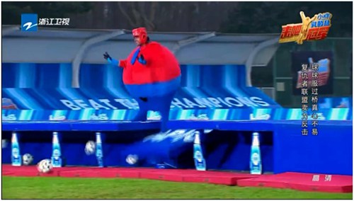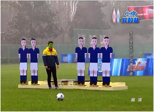 球门位置栓上轮胎,将球踢进轮胎;“直接任意球”在人形墙阻挡和刁钻角度下大力破门。两人首次合作,就显现出默契的配合,战术配合互相传球趁对手松懈时绝杀,面对“贾乃亮”人形靶子时,两球星也是达成共识,球不对准球门,而是冲贾乃亮头上方踢去,吓得亮队长直接跌倒,两位球星也因为恶作剧笑的合不拢嘴。现场观众看了两位球星的精彩表演也惊讶不已,一边赞叹着球星的技术,一边喝着小样乳酸盐为球星纳威助喊。