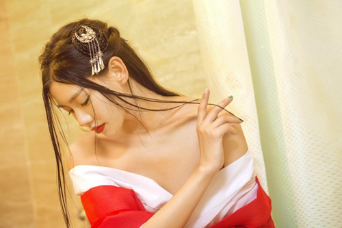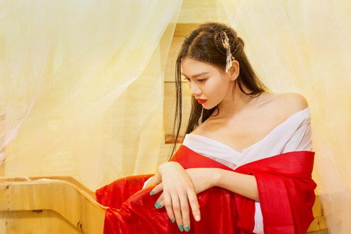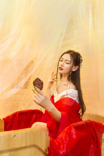 照片中的谢子妍,红衣长发,神韵似紫霞仙子“朱茵”,婉约大气,她红衣遮体,对镜梳妆,绝世出尘。肤如凝脂,吹弹可破,如丝绸之光滑,芦苇之柔韧!
