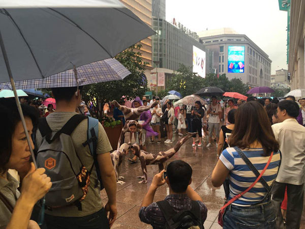 上海滩现雨中表演柔术