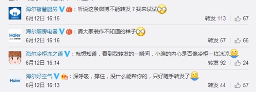 事与愿违的是,苦苦哀求不要转发的一数科技官方微博却遭到了海尔旗下@海尔Uhome智能家居 、@海尔空调 、@海尔冷柜冻之道 、@海尔智慧厨房 、@海尔厨房电器 、@海尔中央空调 、@海尔好空气 、@雷霆世纪 、@小帅影院 、@ThundeRobot雷神笔记本 、@卡萨帝冰吧 等各产线官微和@Qualcomm中国 、@天星轩汉服 、@火影游戏 、@24tidy_泰笛 、@KUS健身 、@极路由 、@华谊兄弟电影 、@环球漫游Wi-Fi 、名龙堂mloong 等其他品牌官微的集体调戏,纷纷抱团转发扩散,配文“听说这条微博不能转发?我来试试”也是让一数科技的小编哭笑不得。