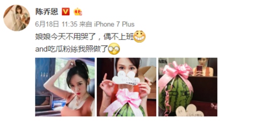除了才貌双全,陈乔恩对粉丝也是有求必应!近日,她在微博上晒出自拍,并回应粉丝说“吃瓜粉丝我照做了!”原来,她收到一张来自粉丝的告白卡片和一只扎着丝带的西瓜,卡片上写着:“乔恩,请和我自拍”,没想到她真的与西瓜合照,完成了粉丝的心愿。