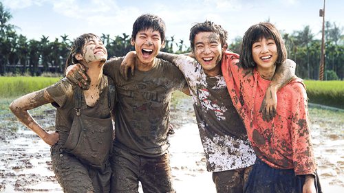 海报中,四位主人公两两搭肩站在夏日的稻田里,虽然满身都是泥泞,但依然难掩脸上阳光灿烂的笑容,透露着一股青春的阳光和不羁以及对人生未知前路的憧憬。正如电影的主题:“人生泥泞,青春不染”所喻示的那样,虽然人生会经历许多挫折,许多挣扎,但唯有青春,在记忆里永远闪亮。