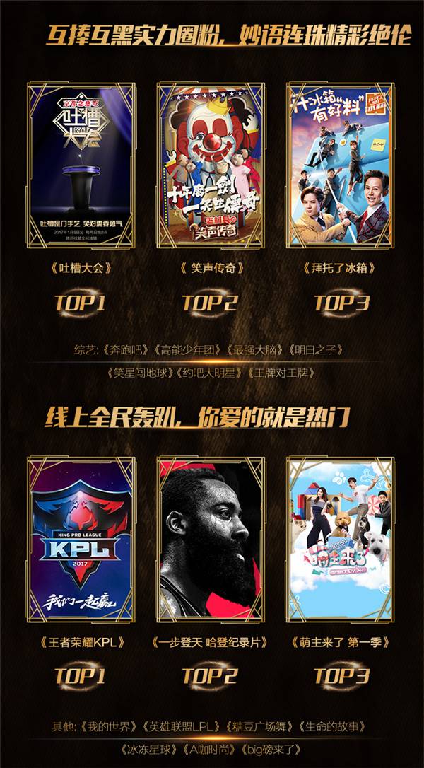 在此次云视听极光的年中盘点中,一组全新的娱乐节目吸引了不少人的目光。实况转播王者荣耀游戏职业联赛的《王者荣耀KPL》开启了网游爱好者的线上轰趴,勇夺该类目冠军。而由腾讯体育出品的史上首档NBA中文纪录片,讲述NBA球星詹姆斯·哈登成长故事的《一步登天》收获新娱乐第二名。一部以明星代班照顾宠物的互动真人秀《萌主来了》也悄无声息的拿下了探花, 这个节目的嘉宾不仅有萌宠,还有刘宪华、杨迪、张歆艺等大牌哟~