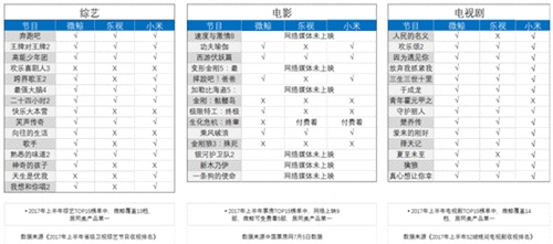 首先来看“吃饭标配”的综艺节目。据《2017年上半年省级卫士综艺节目收视排名》公开资料显示,在2017上半年的综艺TOP15榜单里,热门综艺微鲸覆盖13档独占鳌头,小米却未覆盖《快乐大本营》、《向往的生活》等大热综艺,只覆盖10档,乐视则覆度最低仅有7档。这意味着,当拥有微鲸电视的基友在家刷《快乐大本营》、《向往的生活》、《神奇的孩子》等节目笑得花枝乱颤的时候,你只能羡慕到哭泣。