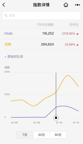 在Hitalk公布代言人不久,微博知名大V如英国报姐、猴姆、生活大爆炸TBBT等纷纷带标签#和汤唯一起Hitalk# 转发花絮视频,在夏日里引起一阵凉爽风波; 根据微信指数的趋势显示,7月10日开始,Hitalk在微信的搜索量涨势明显,并一直维持搜索热度,同比飙升20倍;代言人汤唯的搜索热度也水涨船高。