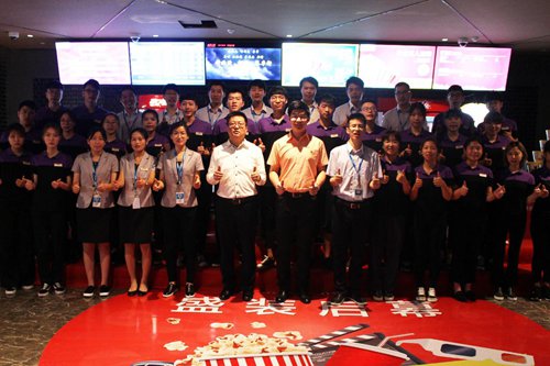 从左到右:湖州日报主任助理蔡洁凡、苏宁云商总经理周俊、苏宁影城公司副总裁郭良、苏宁影城公司总裁助理段大磊