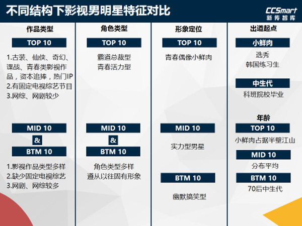 通过对男女明星影视作品中的形象设定的分析,可以发现“强势”的荧幕角色更受喜爱,排名前十的男女演员多有涉及。