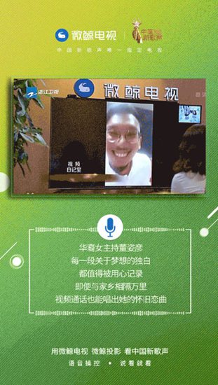 其实《新歌声》“黑幕”不仅在台前,幕后也有哦。细心的观众可以发现,每位选手上场前都在“贴心小屋”视频日记室分享自己的临场感言,而他们身后更放置着一台微鲸电视,成为他们“坚强的后盾”。甚至在上期,晋级周董战队的华裔女主持董姿彦,还用微鲸电视和远在家乡的亲属打了一个“视频电话”。
