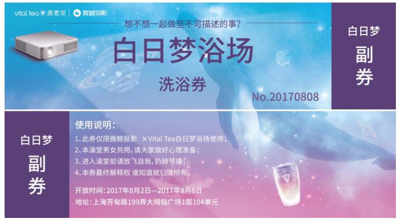 另外,据悉,8月2日-8月8日,微鲸还将在上海的大拇指广场开设一家名叫“白日梦浴场”的快闪店。在微鲸爆出的浴资券中,“男女共用”“放飞自我”“丢掉节操”……一系列惊爆眼球的字眼引人遐想;8月3日微鲸还将组织用户观看电影《三生三世十里桃花》首映,看夜华和浅浅谈恋爱,现场感受“看桃花片”、“走桃花运”、“观桃花剧”、“读桃花书”的一系列玩法。