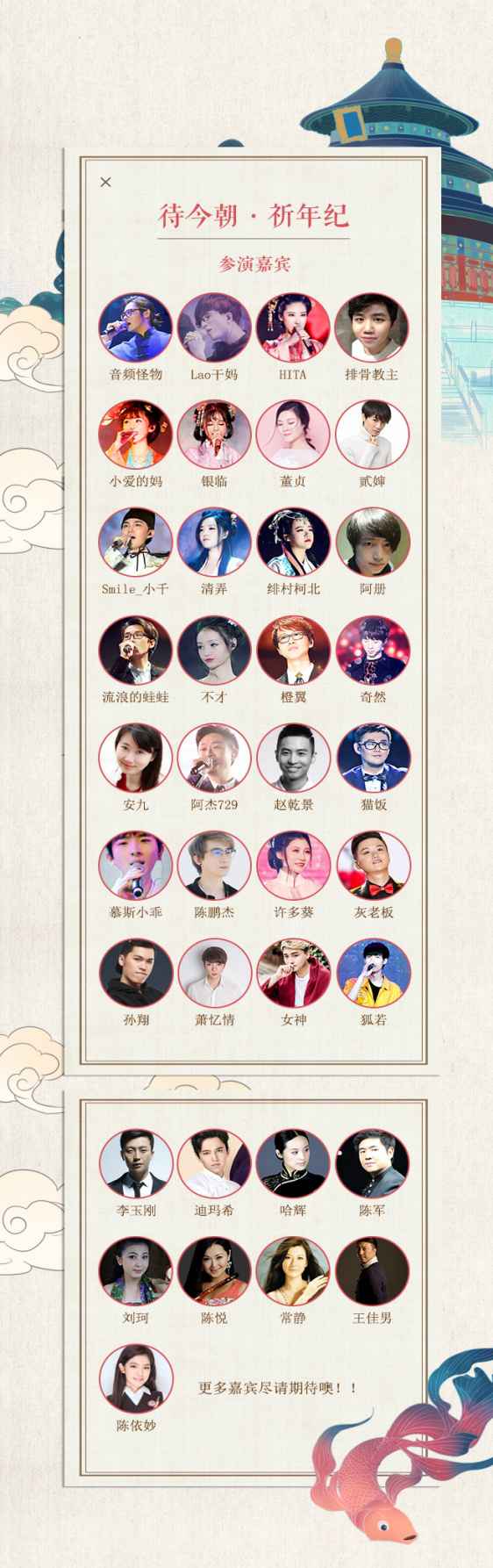 本次盛典可谓是“合纵连横”——既有顶尖与顶尖的汇聚,次元与次元的融合;又有传统与现代的更迭,经典与流行的碰撞。其参演嘉宾一经公布便引来国风音乐爱好者的疯狂转发,纷纷表示这场演唱会是“有生之年”系列。