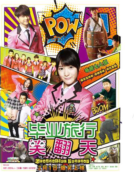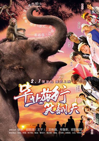 由学冠影业、唐德影视、新影联影业、祥云文化、俪金投资公司诚意出品。青春励志疯狂喜剧《毕业旅行笑翻天》曝光动漫、动物、笑字版三款精美海报,影片定档2018年2月1日于全国爆笑上映。