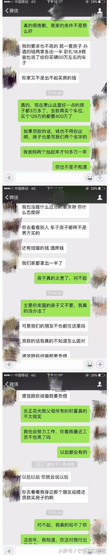 昨天晚上,萧山网友发帖说:“哎,好好的两个人,好了快3年了,理想与现实。聊天记录是获得双方同意的,他们也想看看网友的看法,不想出名。男方是我一个10多年的好兄弟,真的一边聊微信一边在哭,你们能想象180的大男人当街哭是什么感觉吗?”帖子一出,在网络上激起千层浪,网友留言纷纷讲述自己曾经的经历和见解。古往今来,在婚姻和爱情的路上,不管是两小无猜,还是相亲介绍认识,在认识、交往、相恋、结婚的每一个环节,房子、车子等物质基础或多或少成为了双方的筹码和代价。