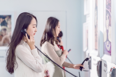 成都展有一个特色就是设置有语音导览电话互动装置,好处之一是可以通过语音介绍来了解更多关于赫本的作品,好吃之二是可以凹造型拍一张充满复古感的照片,用来打卡。