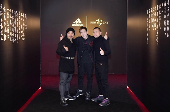 阿迪达斯獒视群雄新品发布会方文山、任哲、萧敬腾在过道区域合影