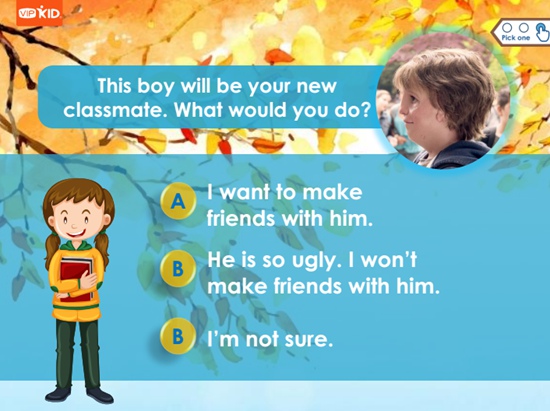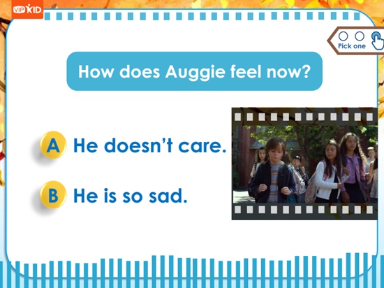 公开课还通过电影情景再现,让孩子们学会站在他人立场上思考问题。在介绍Auggie被同学嘲笑和欺负的时候,北美外教会对小学员提问“How dose Auggie feel now?”(奥吉心里会怎么想?),并列出备选答案“He does not care?”(他无所谓)和“He is so sad.”(他很难过)供小学员选择,让孩子们能够站在奥吉的立场上去思考问题,从而达到共鸣,并学会善意地对待生活中的挫折。