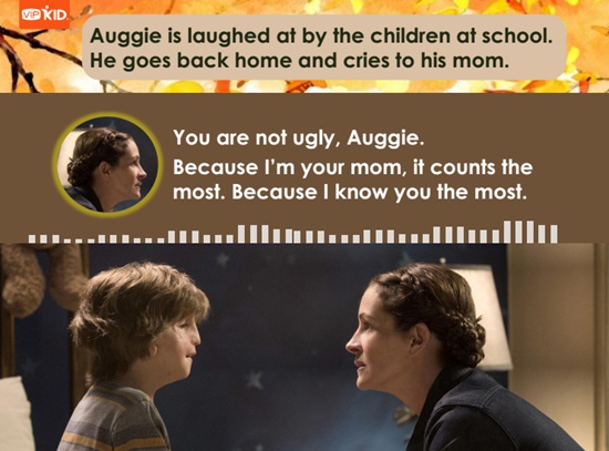 此外,公开课也将电影中的“亲情”概念再次放大,让家长和孩子们通过重温奥吉与妈妈对话的时刻,学会表达自己内心的真实想法,更好地与对方沟通,表达对彼此的爱意。在公开课台词赏析的部分,奥吉由于在学校受到嘲笑和欺负而伤心,妈妈则安慰奥吉:“You are not ugly, Auggie. Because I am your mom, I know you the most.(奥吉,你一点都不难看,因为我是你的妈妈,是最了解你的人)。”朴素的台词将母亲的良苦用心刻画得淋漓尽致,也让孩子更能体会亲情的珍贵。