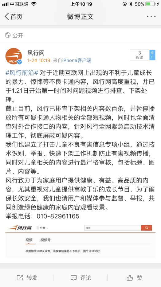 在对内容价值的认真慎思下,风行网认为,卡通人物演绎的各类短视频,与卡通佳作正片本身相比,即使是那些无害的,对儿童也没有太大价值,遑论还可能藏着各种隐藏的风险。