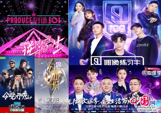 新生综艺探索方向。2018年,爱奇艺和腾讯两大视频网站先后推出《偶像练习生》和《创造101》两档偶像养成类网综,作为国内首档男团女团养成类真人秀节目,称得上是流量井喷,热度爆表,《偶像练习生》播出110天,总播放量为30.6亿,《创造101》网播量更是达到了46.7亿。而最为卫视综艺热门的湖南卫视,江苏卫视分别推出《幻乐之城》、《无限歌谣季》两档音乐综艺。《幻乐之城》立足原创音乐创演,凭借别出心裁的节目模式、一气呵成实时唱演的表现手法以及高难度电影级的舞美制作,广受好评;而《无限歌谣季》以音乐节为形式,由张绍刚、岳云鹏、杨迪、伊一、周峻纬担任歌谣研修生,由薛之谦、李荣浩、毛不易、于文文、符龙飞担任无限唱作人,让专业音乐人化身“无限唱作人”和非专业的“歌谣研修生”搭档创作新音乐。