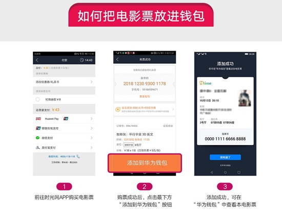 Huawei Pay已经将银行卡、交通卡、门钥匙、eID(公民网络电子身份标识)等放入手机,出行消费购物一部手机即可完成。随着数字化生活场景的不断拓展,Huawei Pay继续以用户体验为中心,从购票观影为切入点,为用户提供将电影票一键添加到华为钱包的便捷服务。