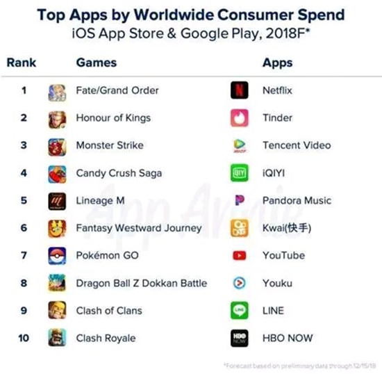 近日,数据机构App Annie公布2018年全球iOS手游收入榜,榜首由Fate系列衍生游戏《Fate/Grand Order》(简称“FGO”)夺得。粗略估计,《王者荣耀》过去一年在苹果商店的收入高达124亿元,这意味着FGO比这个数字还要高。