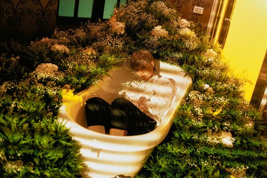 浴室房间背景是明黄色,暖色调与黑白简装相融合,清淡精致的棱角与局促空间的浓重色彩形成对比,在视觉艺术中制造反差引起距离感。蜷缩成一团的少年直观呈现他在浴室里局促不安和空洞彷徨。这组图集概念来自于专辑《浴室与太平洋》概念,少年在成长中受困与狭窄“浴室”的状态。