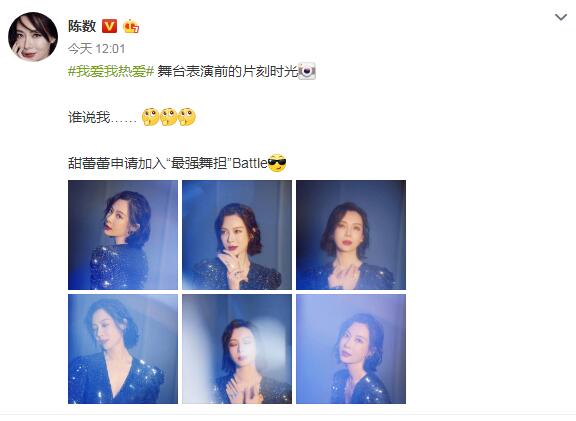 近日,陈数在微博晒出一组舞台风写真,并配文:“甜蕾蕾申请加入‘最强舞担’Battle”。照片上,陈数妆容精致,星星眼影与蓝色blingbling深V裙既梦幻又浪漫,颜值太能打!
