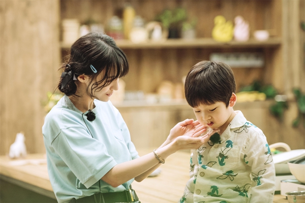 今日发布的这组剧照中,郑爽延续上一期复古校服的清爽少女风,头扎蝴蝶结双麻花辫,搭配彩虹发夹;身着薄荷绿纯色T恤、宽松牛仔裤,脚穿灰蓝色运动鞋。和孩子们互动时,郑爽是温柔暖心的守护者;在厨房里做饭,郑爽又成了能干的小厨娘、私下里克制饮食的自律女演员。