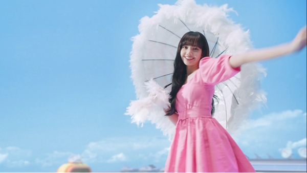 然后伴随着转场,Lisa又穿上粉色洋裙,撑起白羽毛伞,在卡通风格的城市建筑群中,显得复古、简约又甜美。