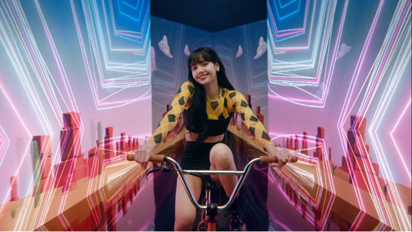 紧接着,Lisa又换上黄黑露脐装,骑着脚踏单车,加上动态的视觉背景,显得Lisa活泼又生动,神态动作间更是展示了她古灵精怪的一面。