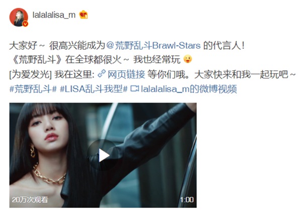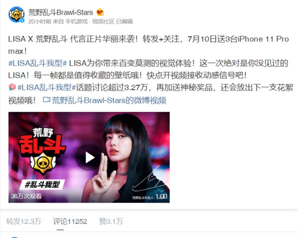 Lisa成为《荒野乱斗》代言人的消息是在6月27日,大约一周以前公布。而到了今天,在微博开屏、微信游戏等处都已经能够看到Lisa的身影。
